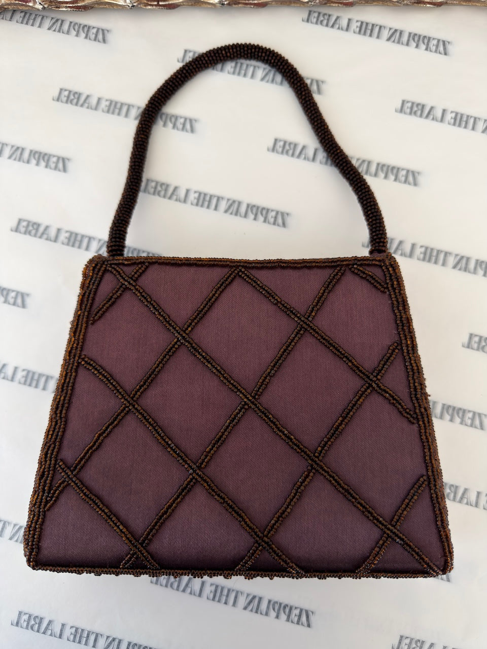 Brown satin, structured evening bag with brown beading.